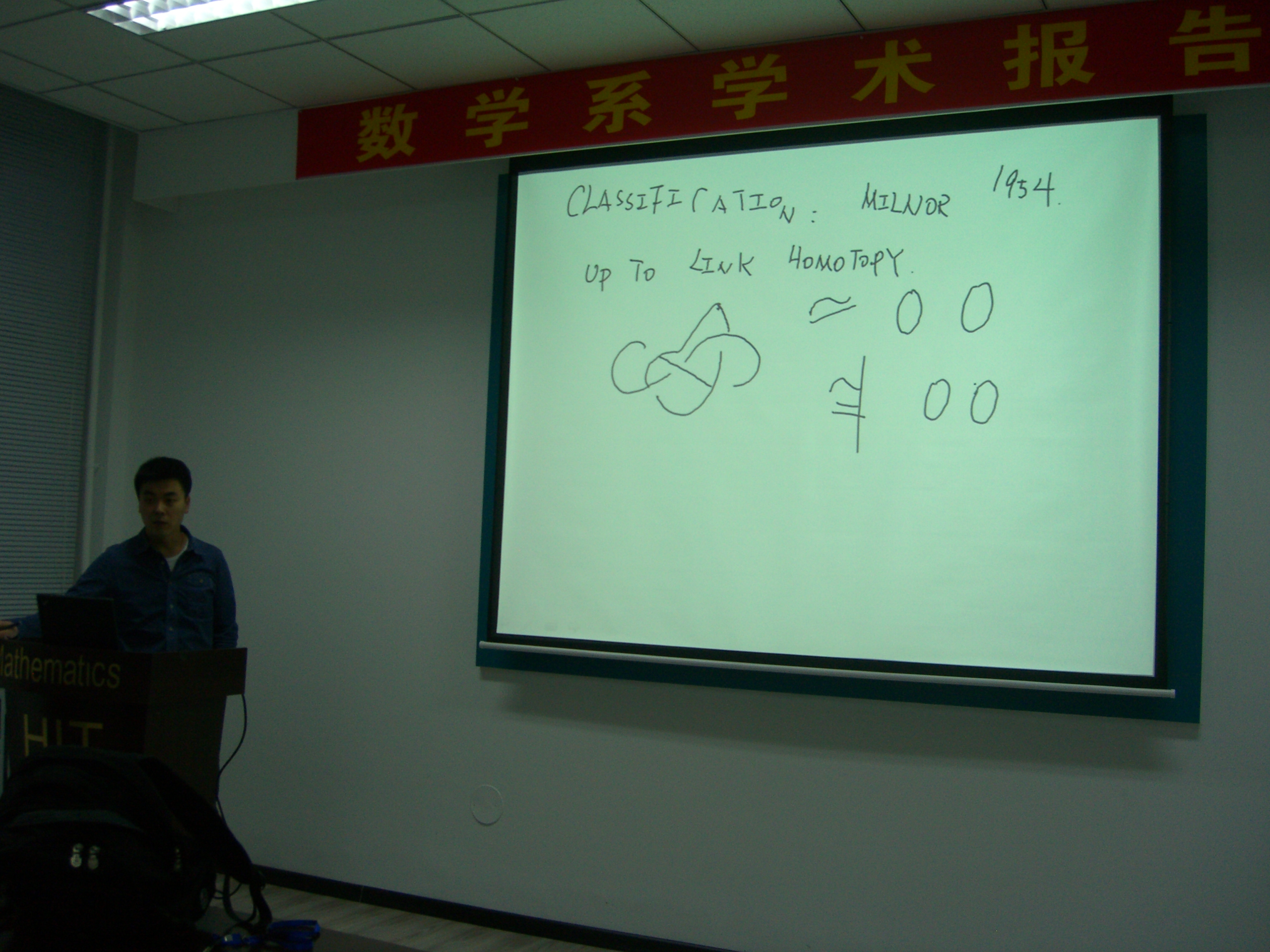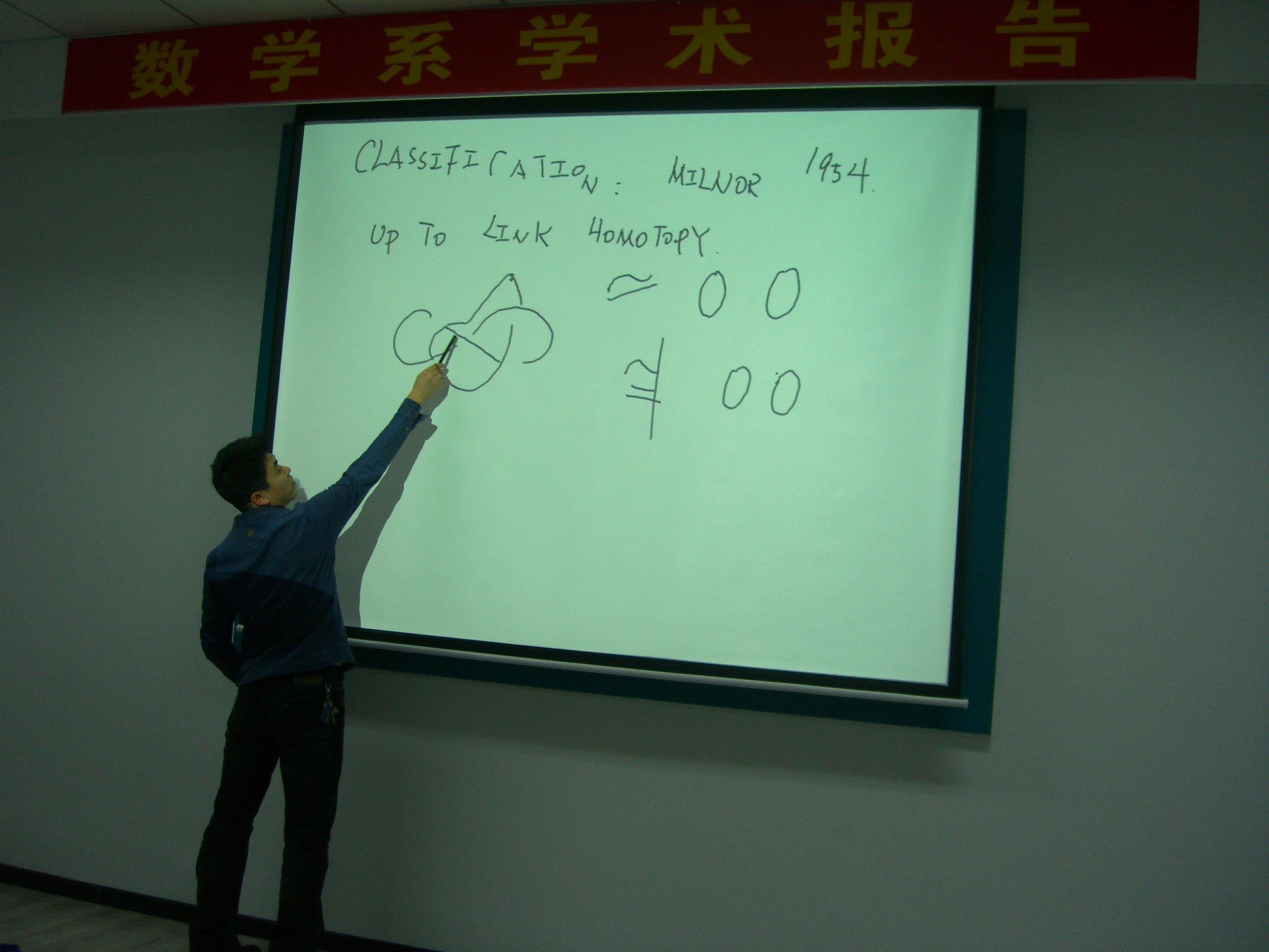 2014年2月28日下午16:00时,taptap点点数学系工科数学分析教学中心张宇副教授在格物楼503做了题目为:《On Brunnian link groups》的学术报告,报告由工科数学分析教学中心尹逊波副教授主持。数学系二十余位师生听取了学术报告并进行了热烈讨论。
