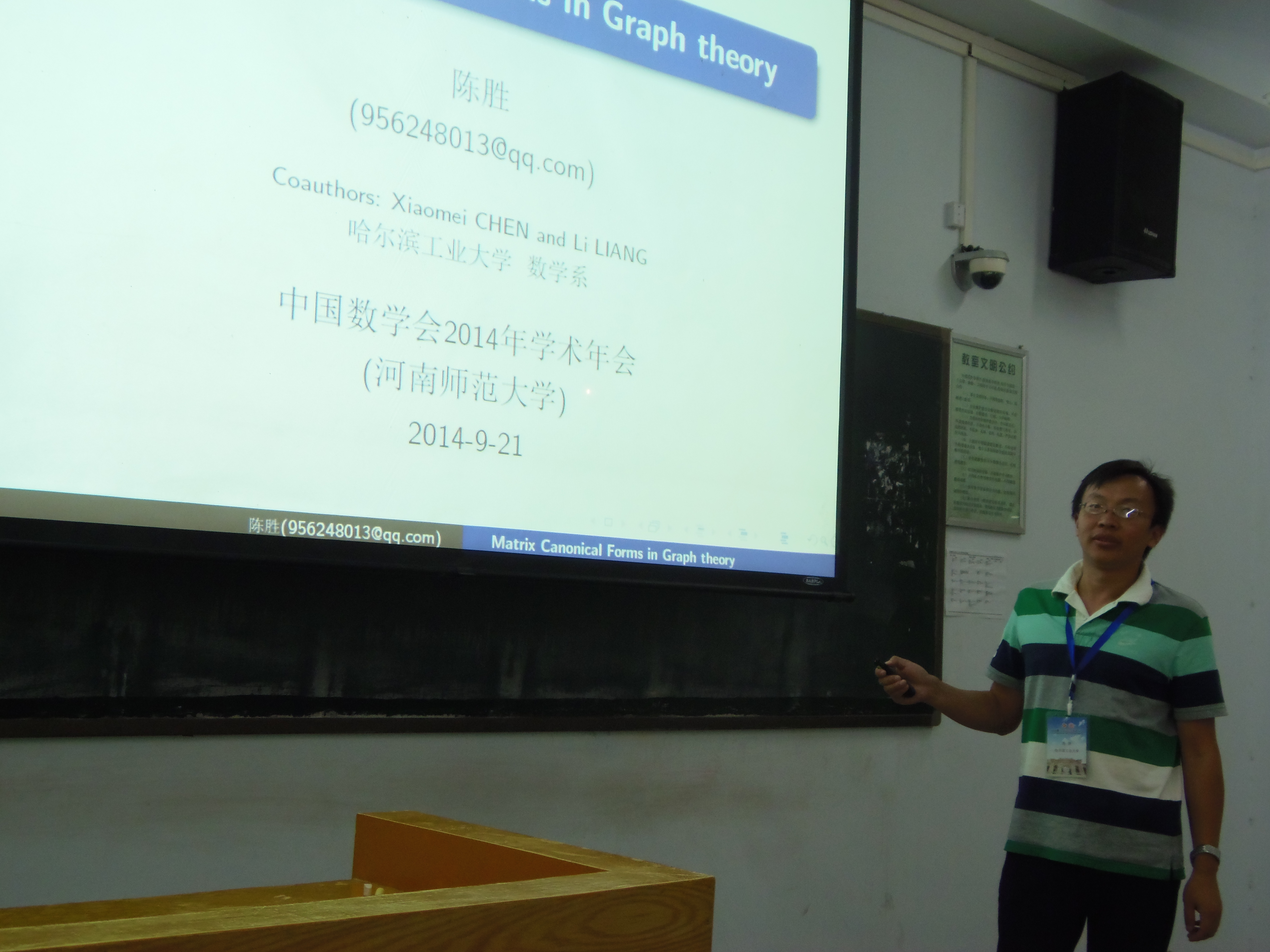 分组报告包含以下主题: 数学物理(含分析、方程、拓扑等)、几何、代数、应用数学、计算与优化。 我系共有2位教授应邀做了分组邀请报告,其中赵景军教授在会议上做了题为“Delay-Dependent Stability Analysis of Symmetric Boundary Value Methods for Linear Delay Integro-Differential Equations”的“计算与优化”分组邀请报告,陈胜教授做了题为“Applications of Theory of Matrix Canonical Forms in Graphs theory”的“代数”分组邀请报告。