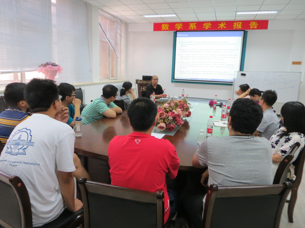 美国食品药品管理局数理统计师张志伟老师在数学系会议室(格物楼503)做了一系列的学术报告,报告由刘伟老师主持,数学系十余位师生听取了报告并进行了热烈的讨论。