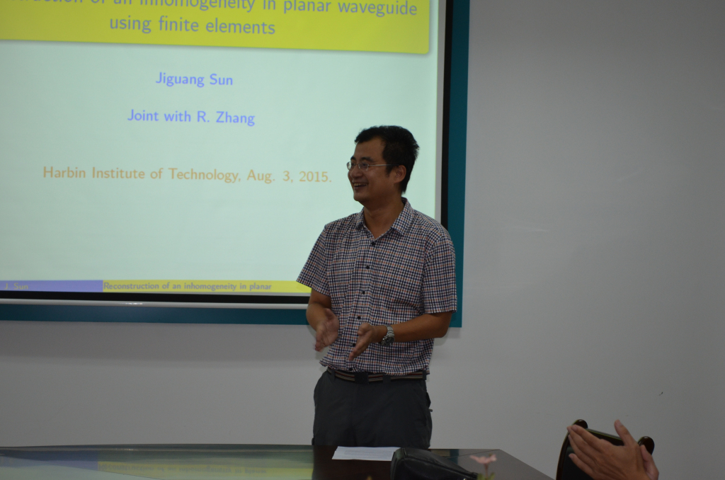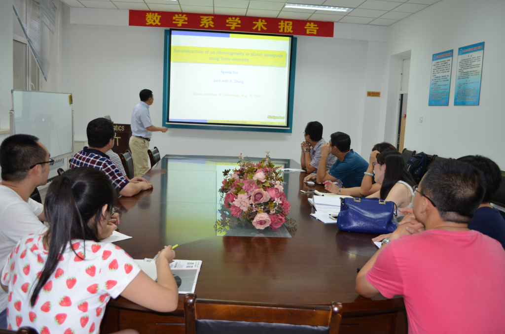 2015年8月3日15:30-17:00,美国密歇根科技大学的孙继广副教授在数学系会议室(格物楼503)做了题为《The reconstruction of obstacles in a waveguide using finite elements》的学术报告,报告由陈勇老师主持,数学系十余位师生听取了报告并进行了讨论。