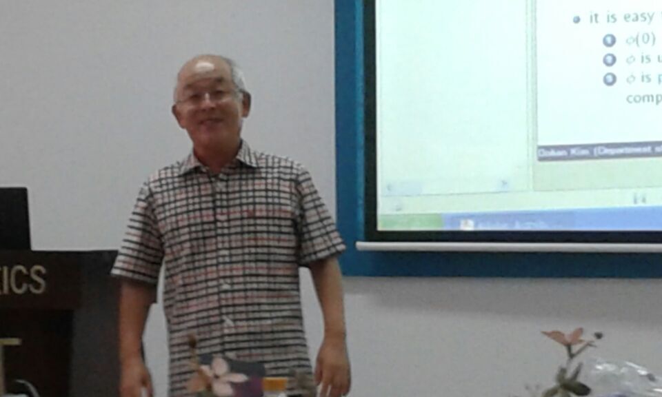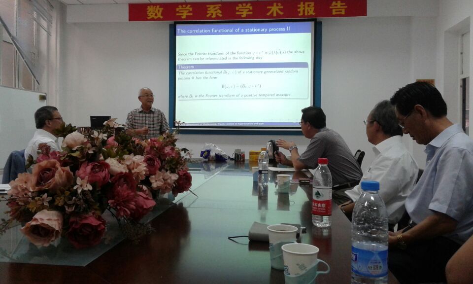 2015年8月13日下午15:00-17:00和8月14日上午10:00-12:00,韩国数学会前会长金道汉教授在数学系会议室(格物楼503)作了题为《Recent history of Korean Mathematical Society: How could we host 2014 Seoul ICM from a developing country》、《Fourier analysis on hyperfunctions》、《Stationary hyperfunctional random process》、《Periodic and almost periodic hyperfunctions》的学术报告,报告由付永强教授主持,数学系二十余位师生听取了报告并进行了热烈的讨论。