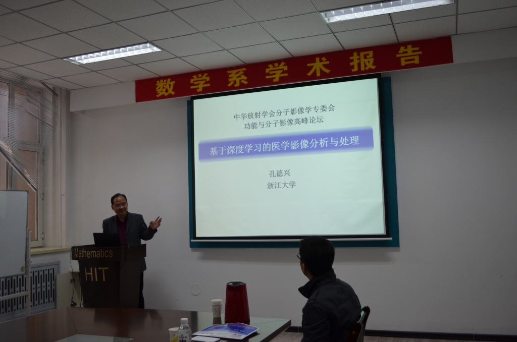 2016年4月25日13:30-14:30,浙江大学孔德兴教授在数学系会议室(格物楼506)做了题为《基于深度学习的医学影像分析与处理》的学术报告,报告由孙杰宝副教授主持,数学系四十余位师生听取了报告,并进行了热烈的讨论。