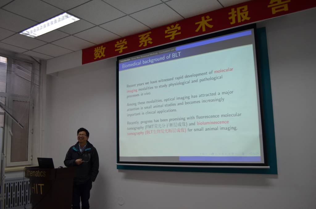 2016年4月25日14:30-15:30,来自浙江大学的程晓良教授在数学系会议室(格物楼506)做了题为《 Some Numerical Methods for Inverse Problems in Bioluminescence Tomography》的学术报告,报告由王希连老师主持,数学系三十余位师生听取了报告并进行了热烈的讨论。