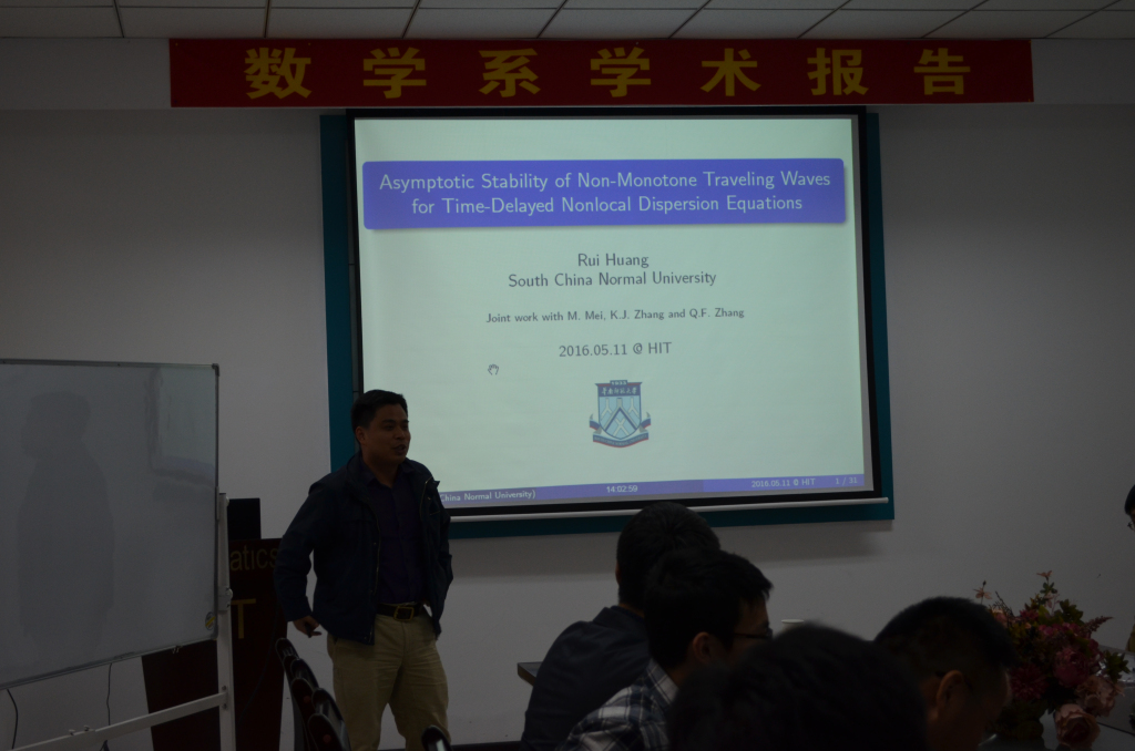 2016年5月11日14:00,华南师范大学黄锐教授在数学系会议室(格物楼503)作了题为《Asymptotic Stability of Non-Monotone Traveling Waves for Time-Delayed Nonlocal Dispersion Equations》的学术报告,报告由孙杰宝老师主持,数学系50余位师生听取了报告,并进行了热烈的讨论。