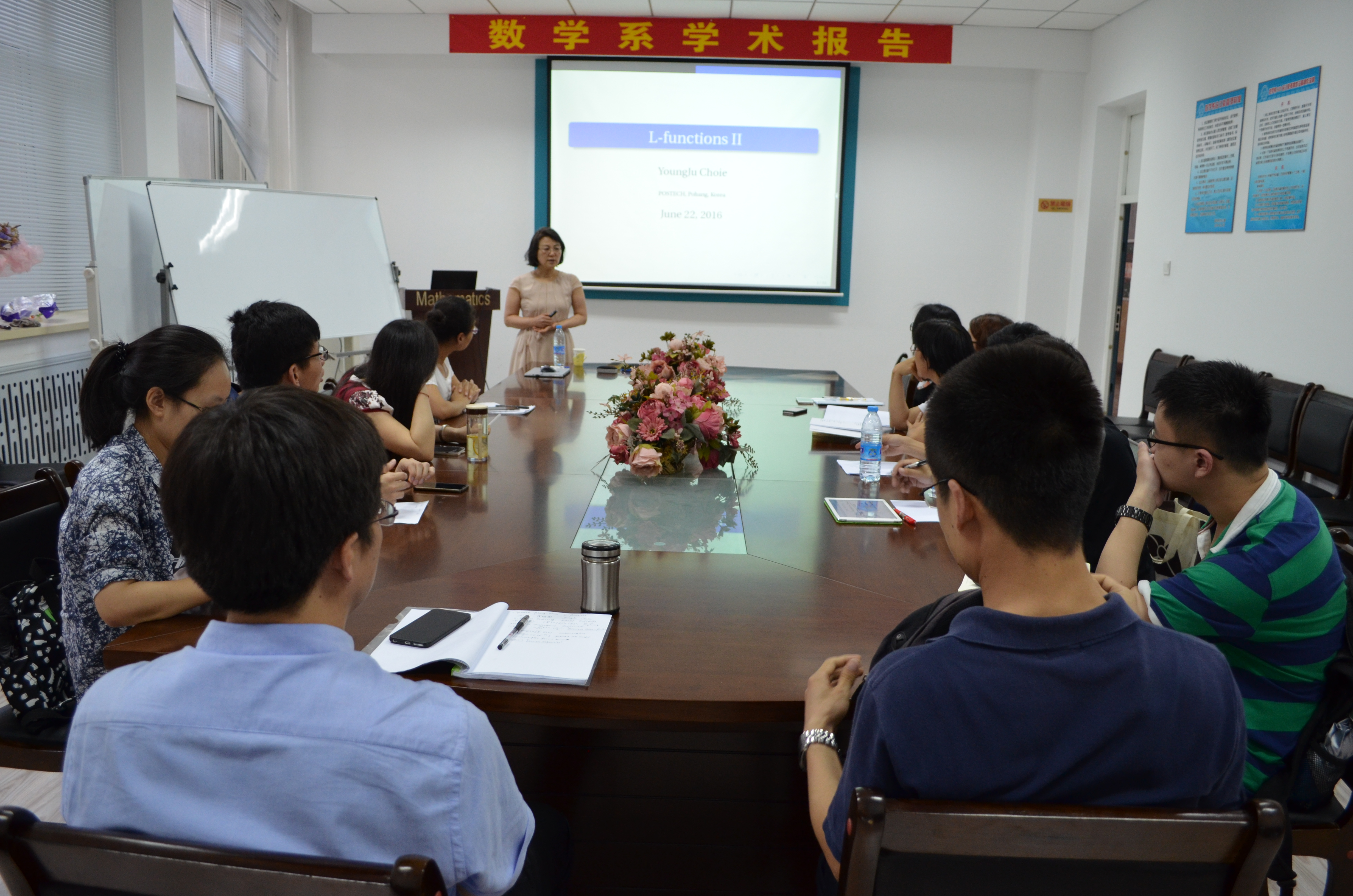 2016年6月21日和6月22日下午2:00-3:30,韩国浦项理工大学数学系YoungJu Choie 教授在数学系会议室(格物楼503)为我们带来了两场精彩的报告,题目分别为《Modular L-functions I 》《Modular L-functions II》,报告由张毅超教授主持,数学系十余位师生听取了报告,并进行了热烈的讨论。