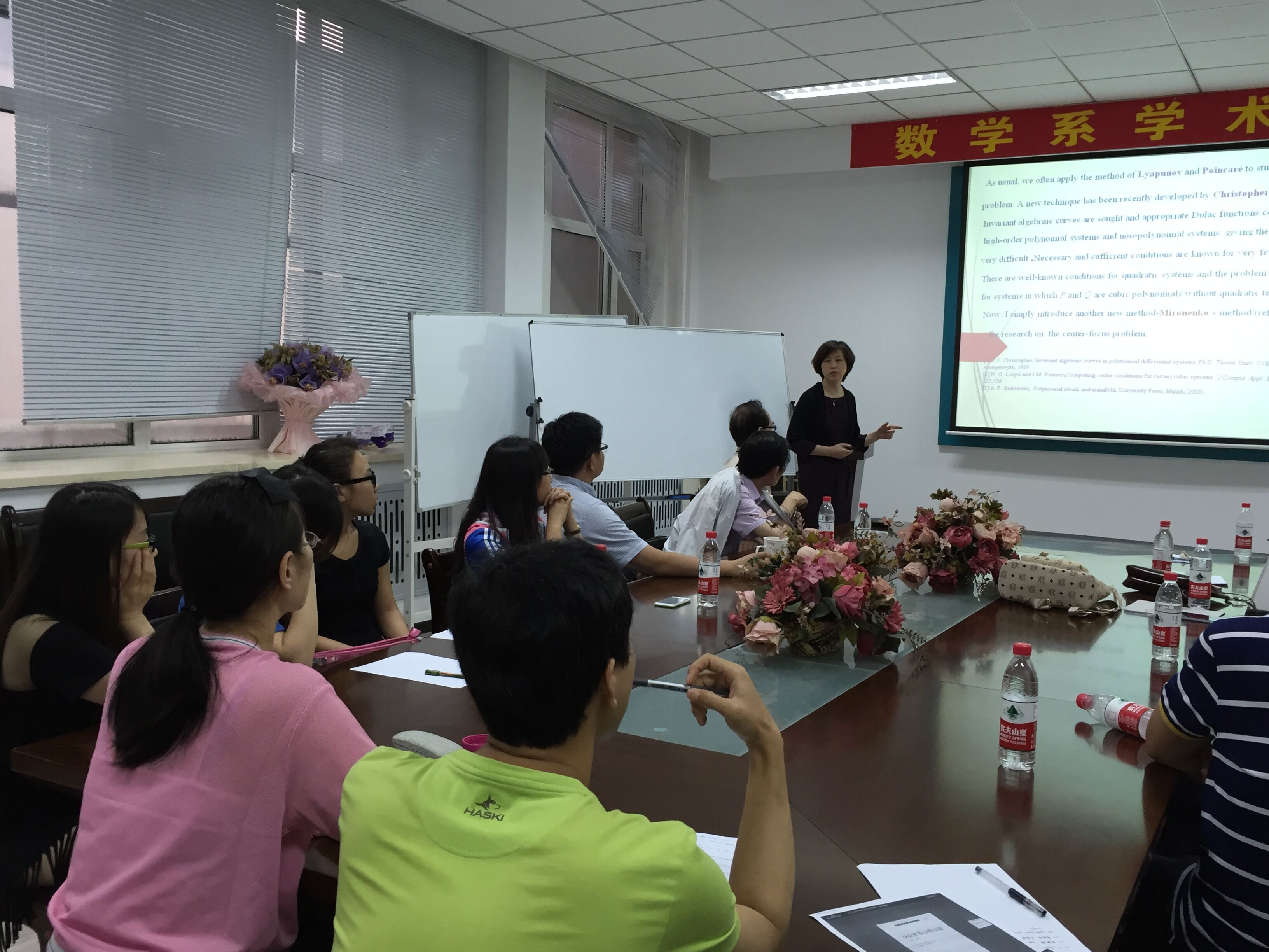 2016年6月25日上午10:00--11:00,扬州大学周正新教授在数学系会议室(格物楼503)做了题为《A new method for research on the Poincaré center-focus problem》的学术报告,报告由蒋卫华老师主持,数学系20余位师生听取了报告,并进行了热烈的讨论。