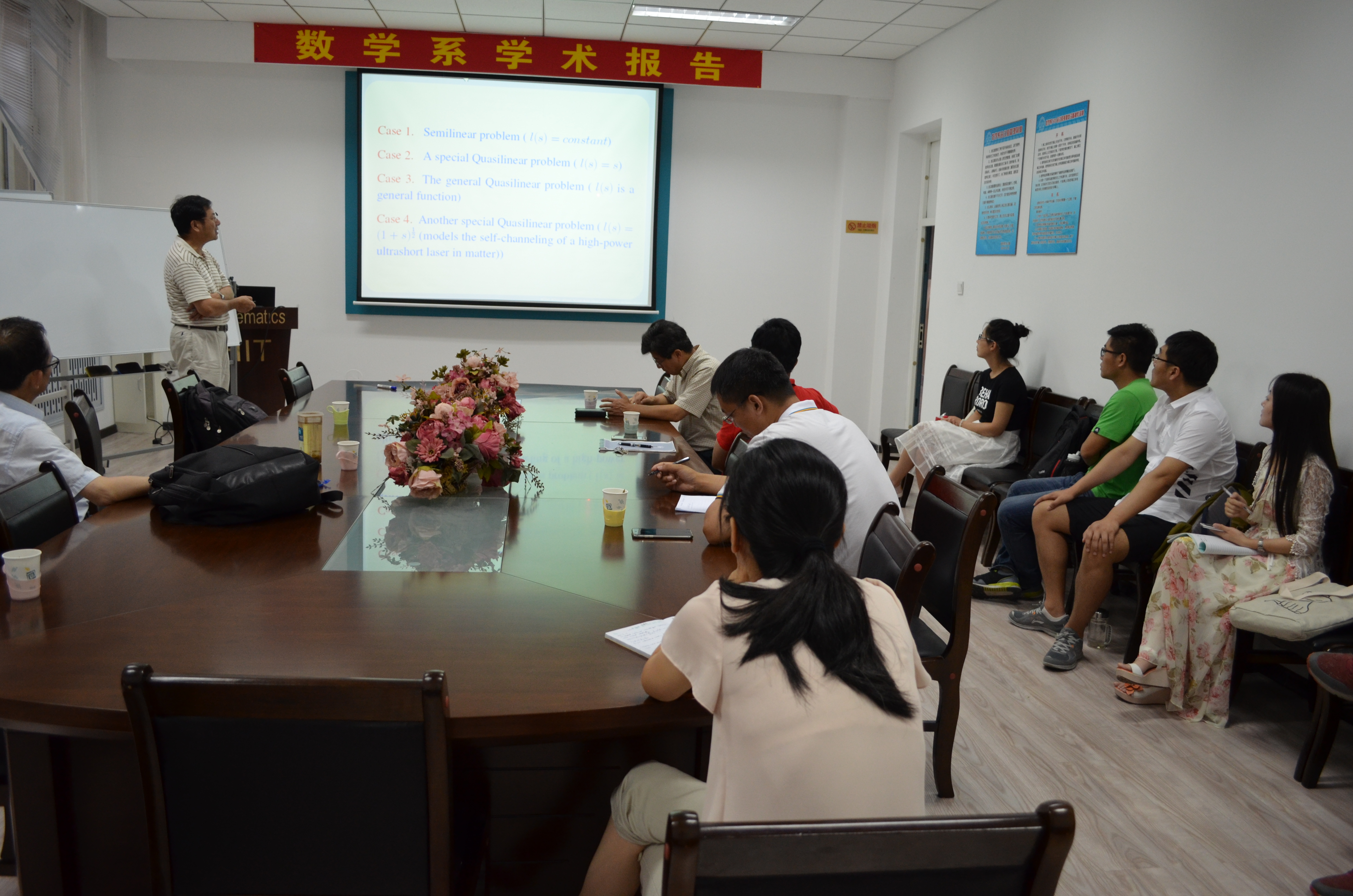 2016年7月12日上午10: 10--11:10 ,华中师范大学邓引斌教授在数学系会议室(格物楼503)做了题为《Solitary wave solutions to a quasilinear Schrodinger equation》的学术报告,报告由许全华教授主持,数学系十余位师生听取了报告并进行了热烈的讨论。