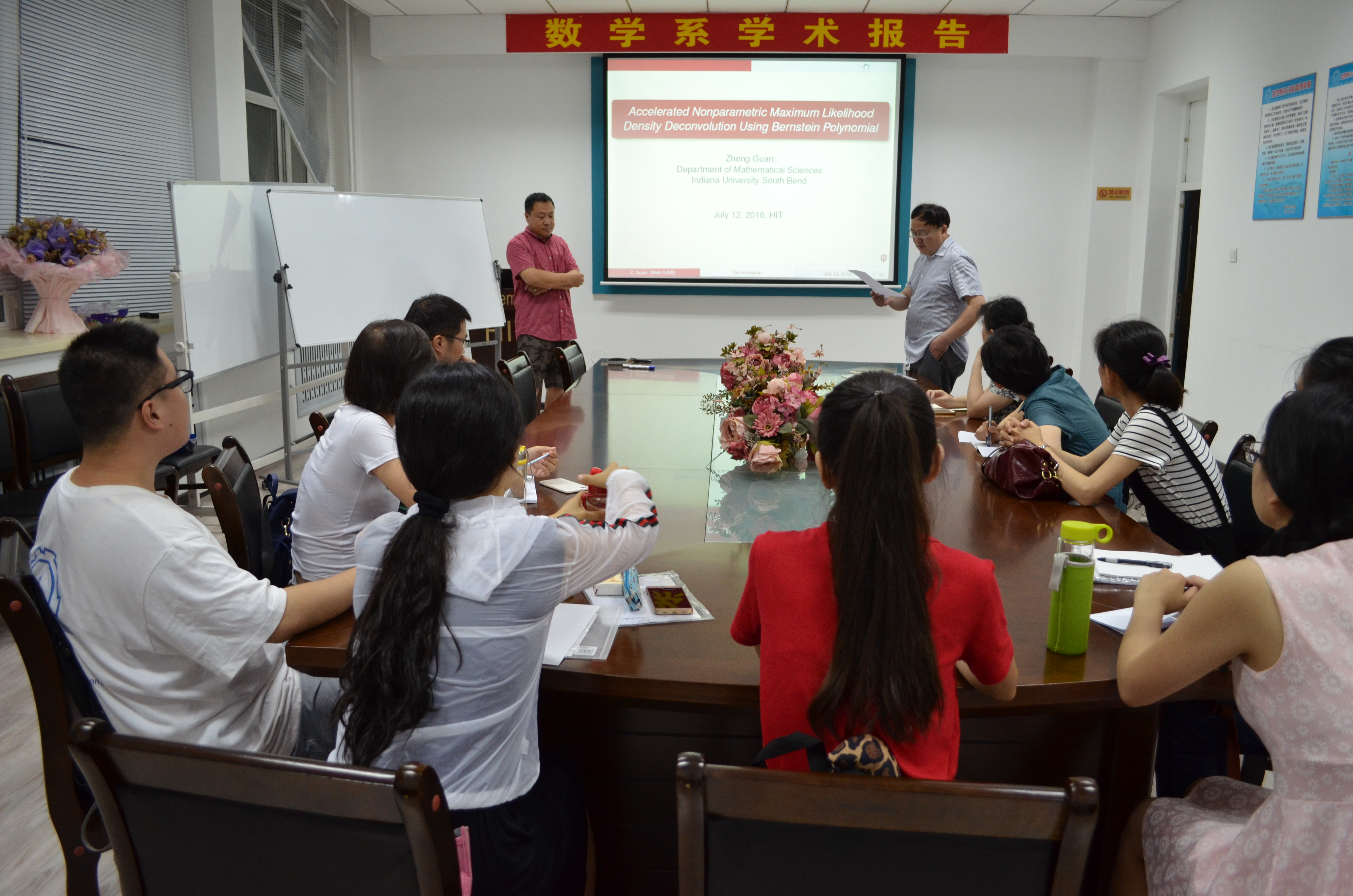 2016年7月12日下午15:00-16:30, 美国印第安纳大学南本德分校关忠教授在数学系会议室(格物楼503)做了题为《Accelerated Nonparametric Maximum Likelihood Density Deconvolution Using Bernstein Polynomial》的学术报告,报告由田波平教授主持,数学系十余位师生听取了报告,并进行了热烈的讨论。