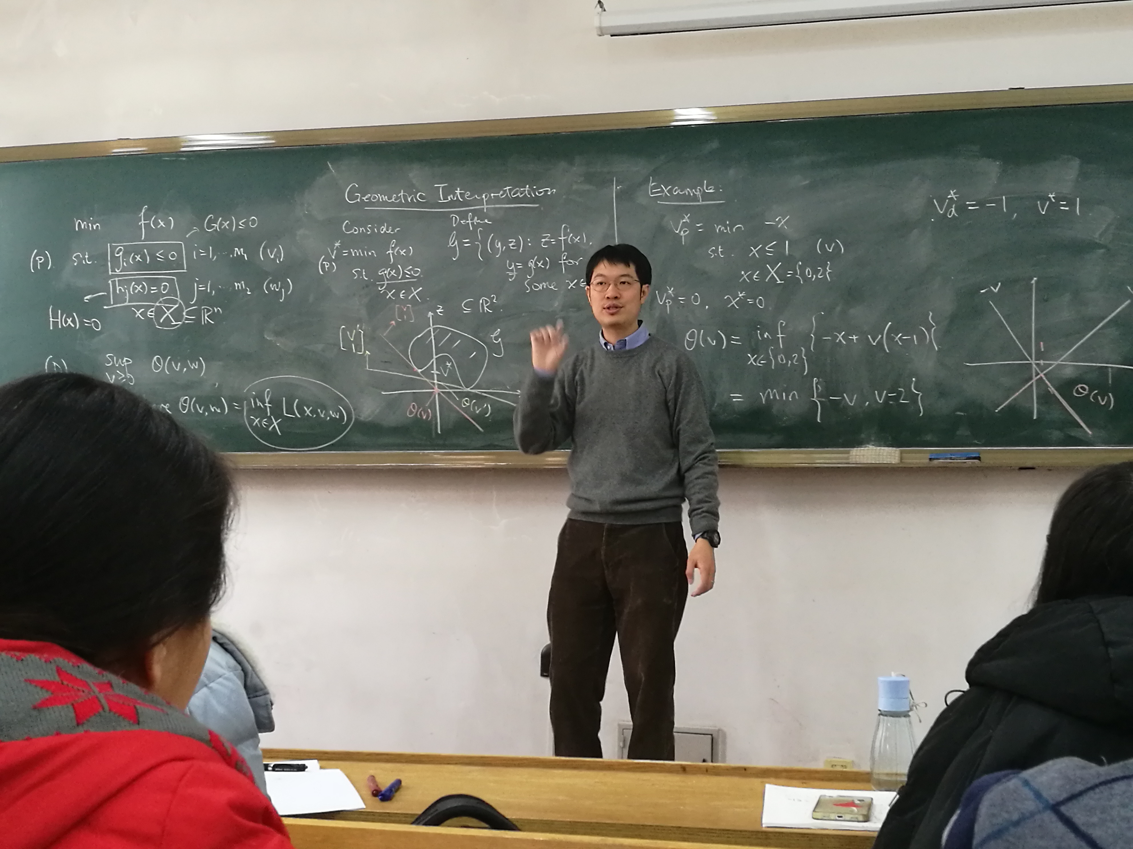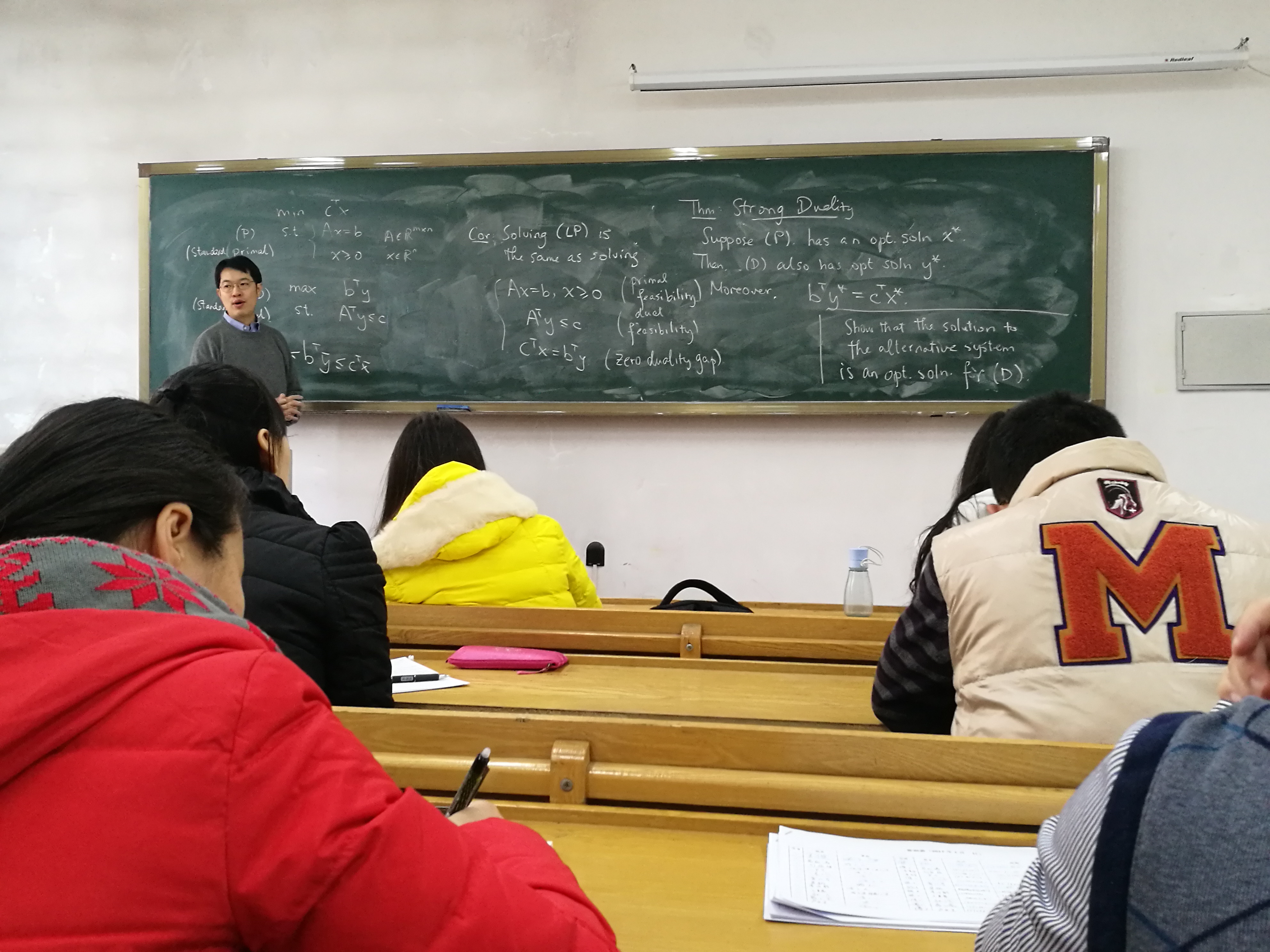 优化理论是一门实践性很强的学科,广泛应用于电子工程、通讯工程、自动控制、系统识别、资源分配、经济管理等众多领域。 香港中文大学的Anthony Man Cho So 苏文藻教授,是目前优化领域的优秀青年学者,对优化基础理论及算法有深入的理解,在优化领域顶级期刊如SIAM Journal on Optimization、Mathematical Programming、Mathematics of Operations Research等发表多篇文章。 苏文藻教授此次来访taptap点点官方网站,为数学系的教师和研究生进行了为期5天共计16个学时的授课。这次短期课程的内容主要涉及优化的基础问题。苏文藻教授从优化问题的相关基本概念出发、重点介绍了线性规划及凸规划的解的存在性、对偶问题等,最后介绍了相关的优化算法。苏文藻教授授课深入浅出,善于用浅显易懂的图表来表达深奥艰涩的数学概念,使学生受益良多。 苏文藻教授此次的短期课程内容丰富,涉及范围广泛,许多非优化方向的学生也来参加了此次课程,他们均表示收获很多,也将自己的研究方向与苏文藻教授进行了探讨,开拓了他们未来的研究思路。 另一方面,也有一些其他学校和学院(如哈尔滨师范大学、哈尔滨理工大学、黑龙江工程学院等)的学生和老师参加了苏文藻教授此次的短期课程。大家均表示对优化问题有了更清晰和更深刻的理解。 最后,此次短期课程的开展,为促进数学特别是优化与应用的发展及相关方面的人才培养起到了重要的推动作用。