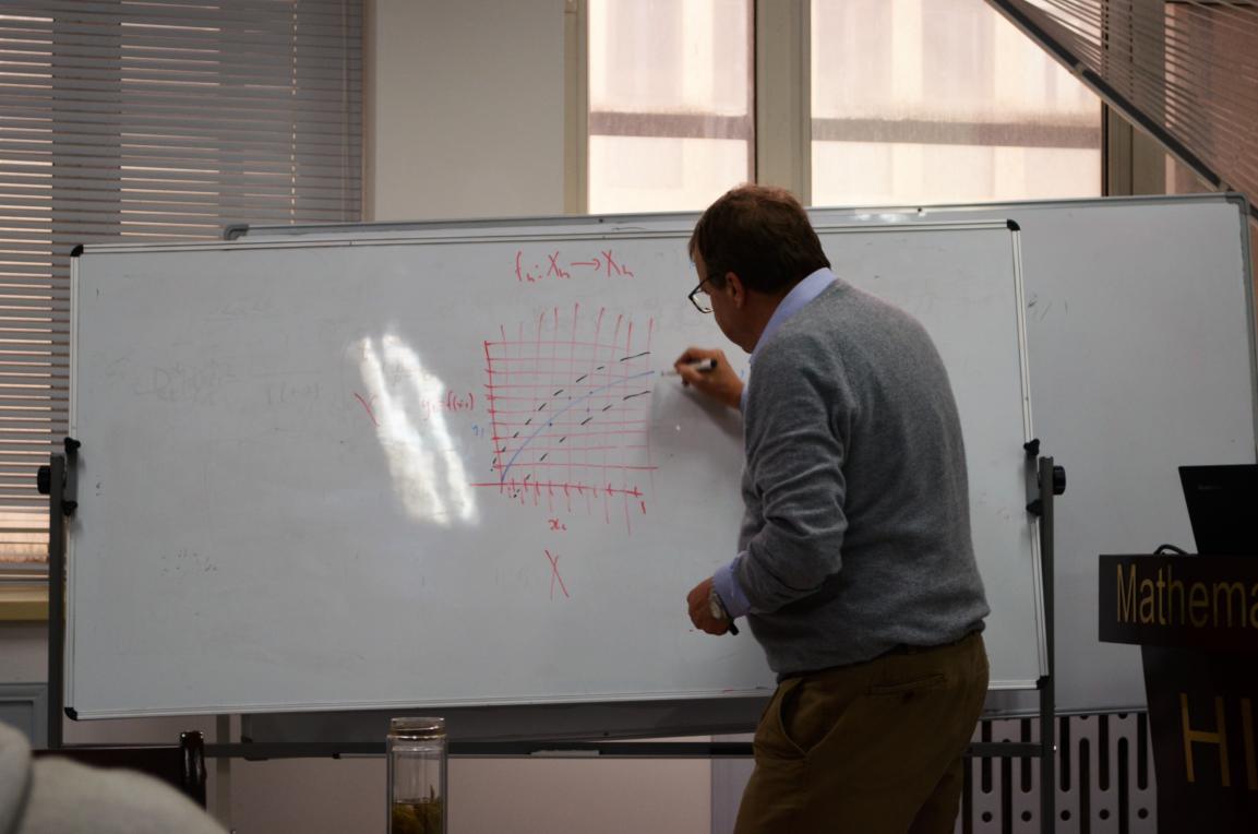 应宋明辉教授的邀请,华中科技大学Peter Kloeden教授将于5月5日(周五)上午9:30-11:00在格物楼503会议室做了精彩的报告,题目为: “Spatial discretisation of dynamical systems”。 Peter Kloeden 教授于1971年在麦考瑞大学获得学士学位,1975年在昆士兰大学获得博士学位。他是随机微分方程数值方法和随机动力系统等研究方向的国际知名专家(SIAM Fellow),其研究方向为动力系统和遍历理论,概率论和随机过程,微分方程数值分析等。被SCI收录论文300余篇,专著4本,在Google Scholar上被引用17454次。 Kloeden教授先后在澳大利亚 Deakin大学、德国Frankfurt大学任教授,现为华中科技大学数学与统计学院的特聘教授。曾担任SIAM J. Numerical Analysis、Foundation of Computational Mathematics、Nonlinear Analysis: Theory, Methods and Applications等国际著名期刊编委。现为杂志Discrete and Continuous Dynamical Systems-Series B的主编, 担任Journal of Difference Equations and Applications、Stochastics & Dynamics、Advanced Nonlinear Studies等十余种杂志的编委。 2012年9月,Kloeden教授获得美国工业与应用数学学会(SIAM)颁发的W.T. and Idalia Reid Prize。