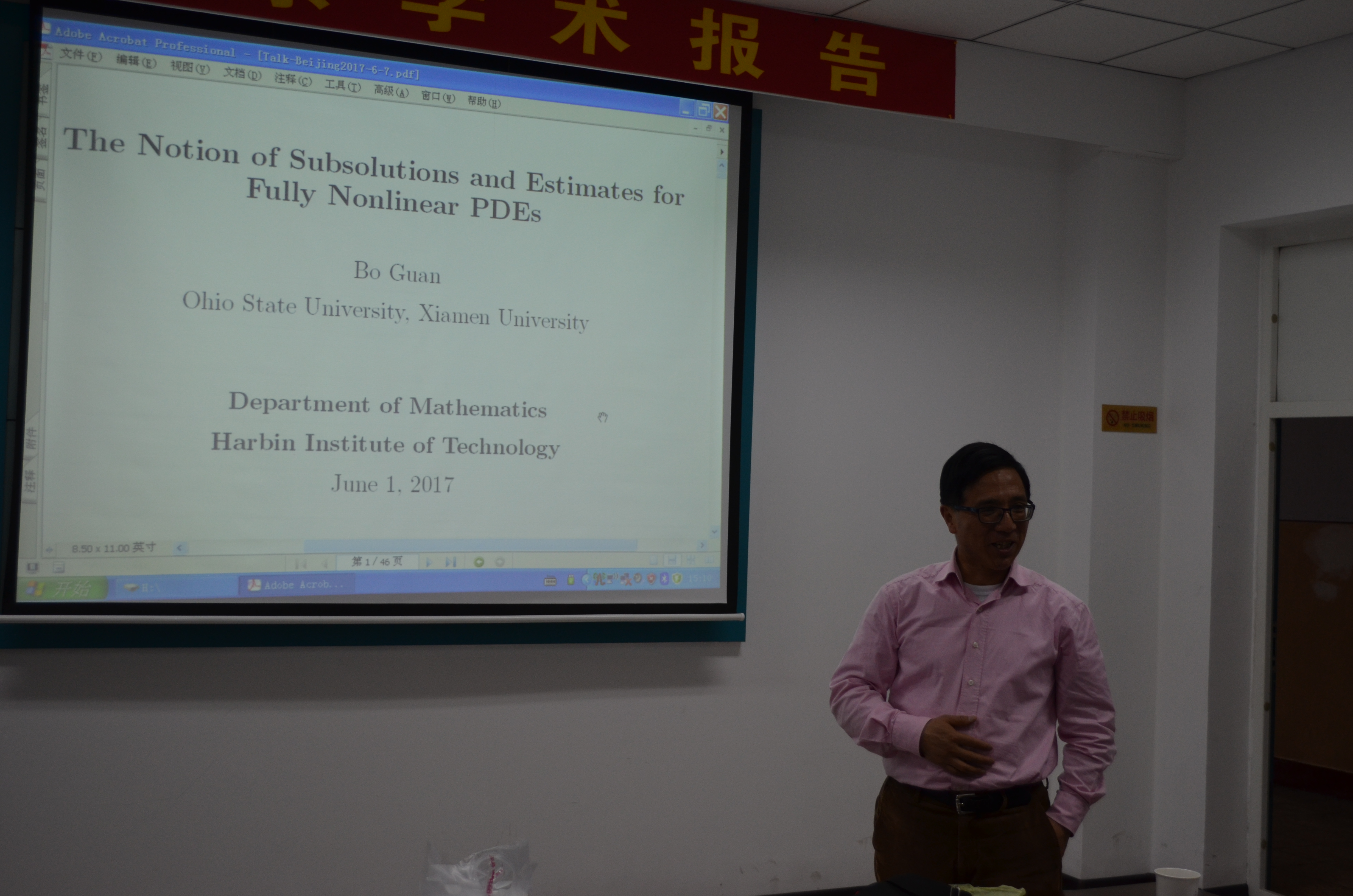 应taptap点点官方网站数学系吴勃英教授邀请,2017年6月1日下午15:00—16:00在格物楼503会议室,美国俄亥俄州立大学关波教授来访数学系并做学术报告。报告题目:The notion of subsolution and estimates for fully nonlinear equations on manifolds,报告由许全华教授主持,数学系近五十位师生听取了报告,并进行了热烈的讨论。