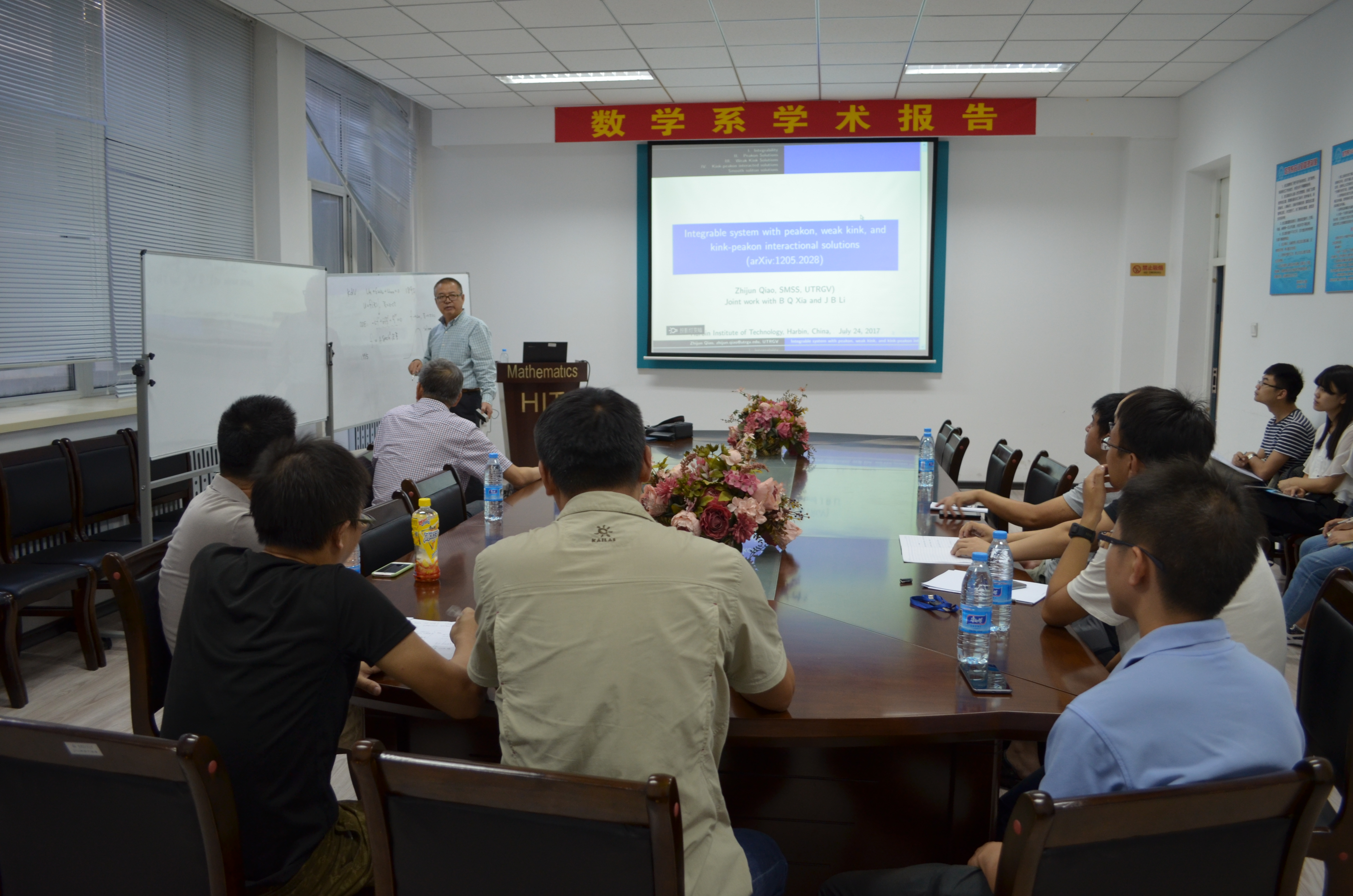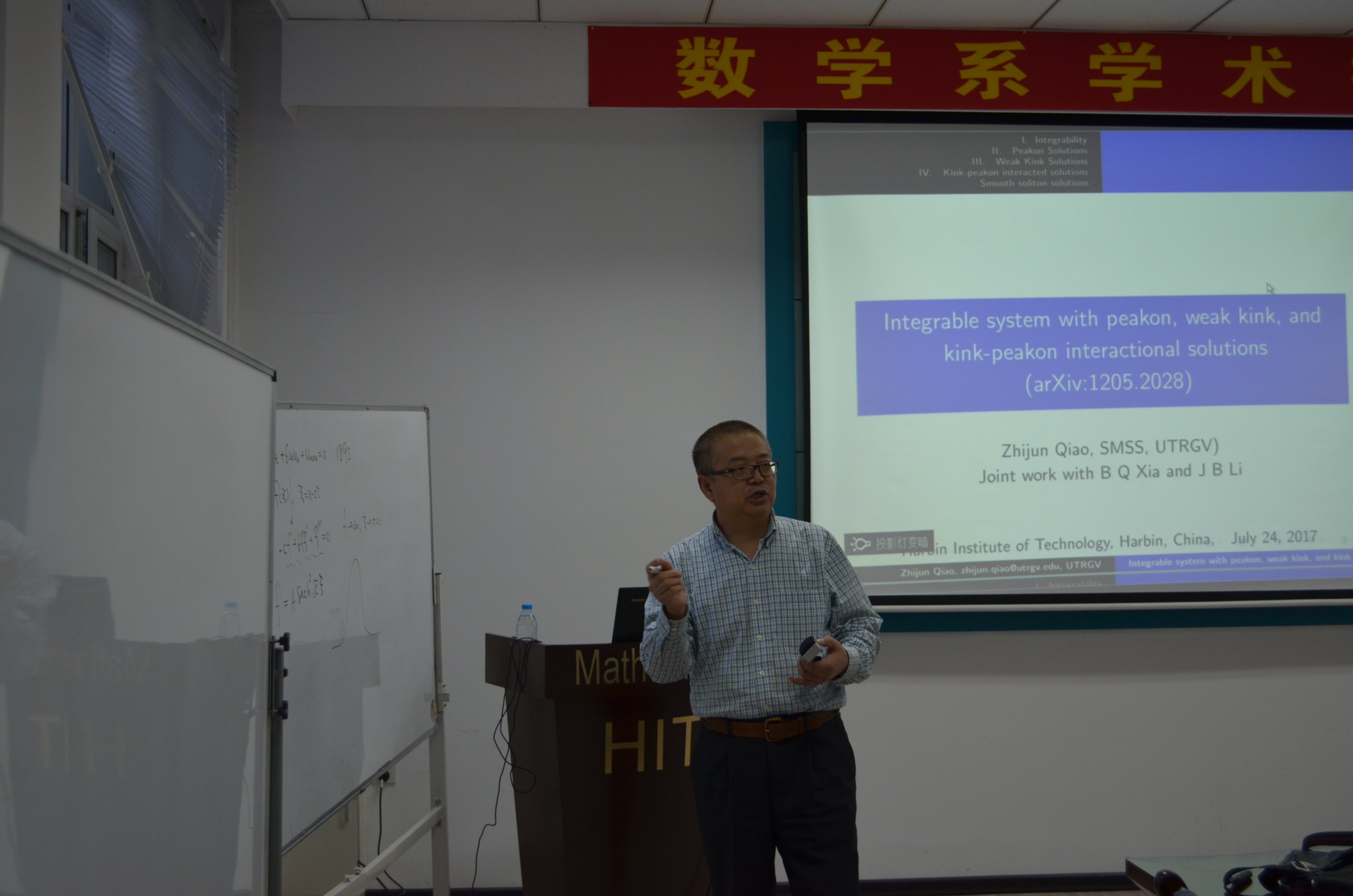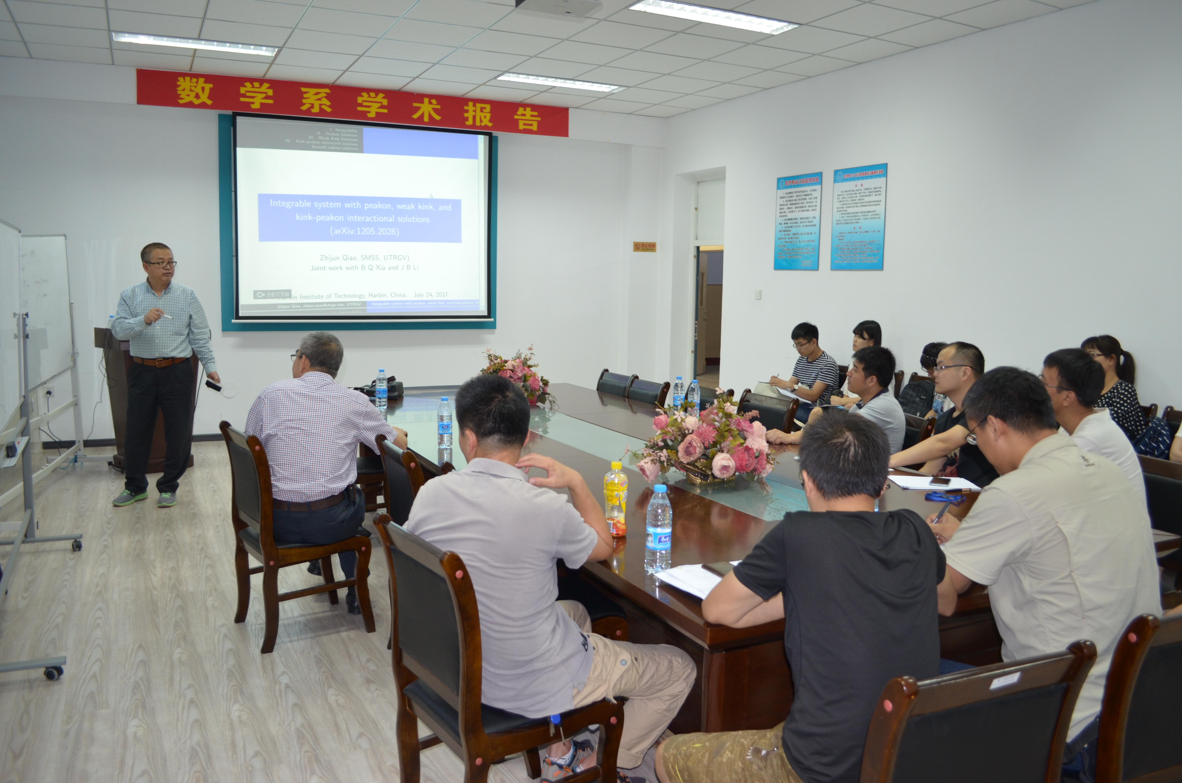 应数学系薛小平教授邀请,美国德克萨斯大学乔志军教授于7月25日访问taptap点点官方网站数学系,并作题目为:Integrable system with peakon, weak kink, and kink-peakon interactional solutions的报告。乔教授在报告中向大家介绍了一类非线性偏微分方程,此类方程是可积系统,带有Lax-pair和bi-Hamiltonian结构。该报告向大家介绍了此类方程的一些显式解:带有尖点的孤立子解、多个孤立子、一类新的扭结解。此外,乔教授也对多个孤立子之间的相互作用进行了研究。该报告由薛小平教授主持,相关专业的多位师生参与了讲座,并对讲座内容展开了热烈的讨论。乔教授的报告深入浅出,得到了大家的一致好评。