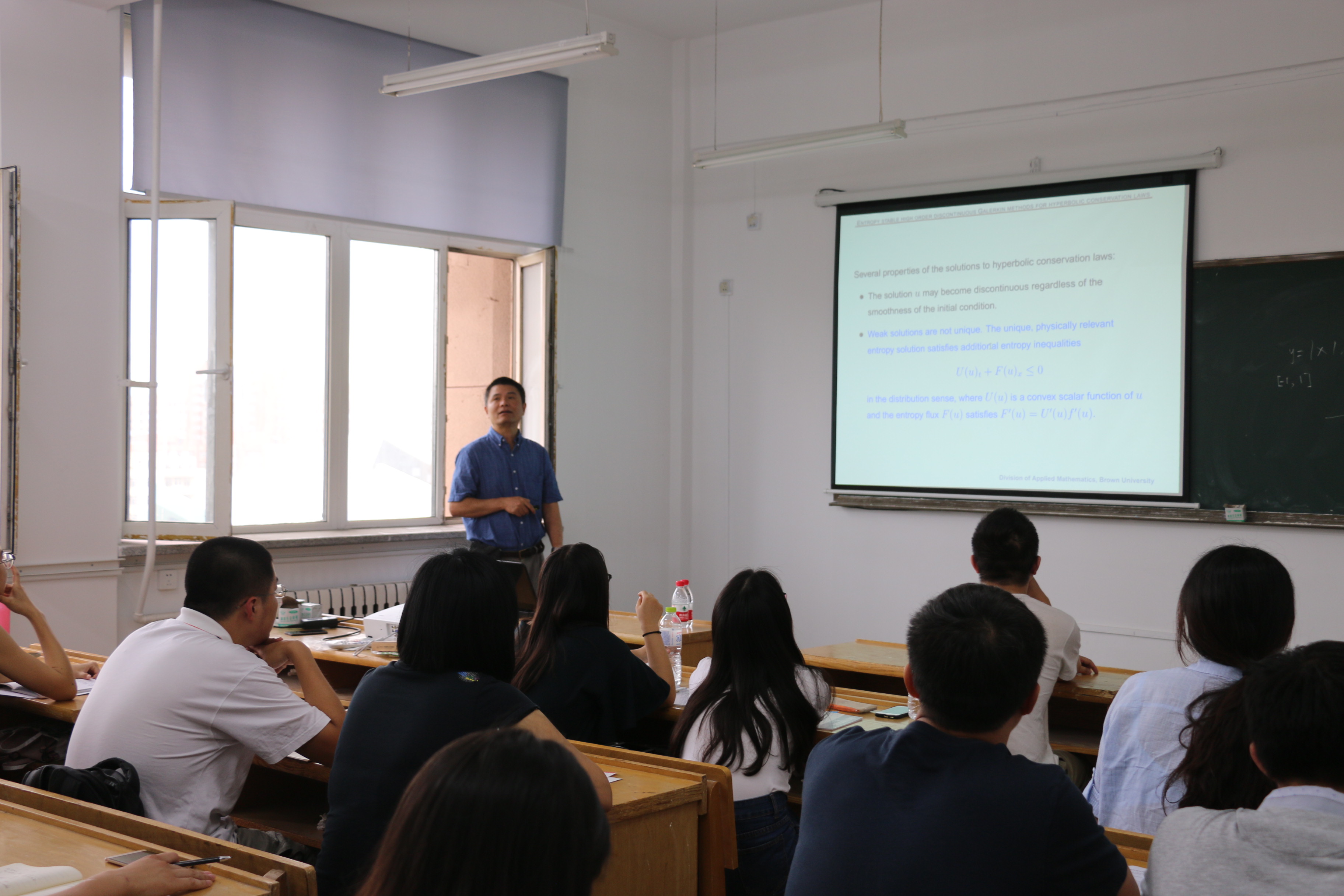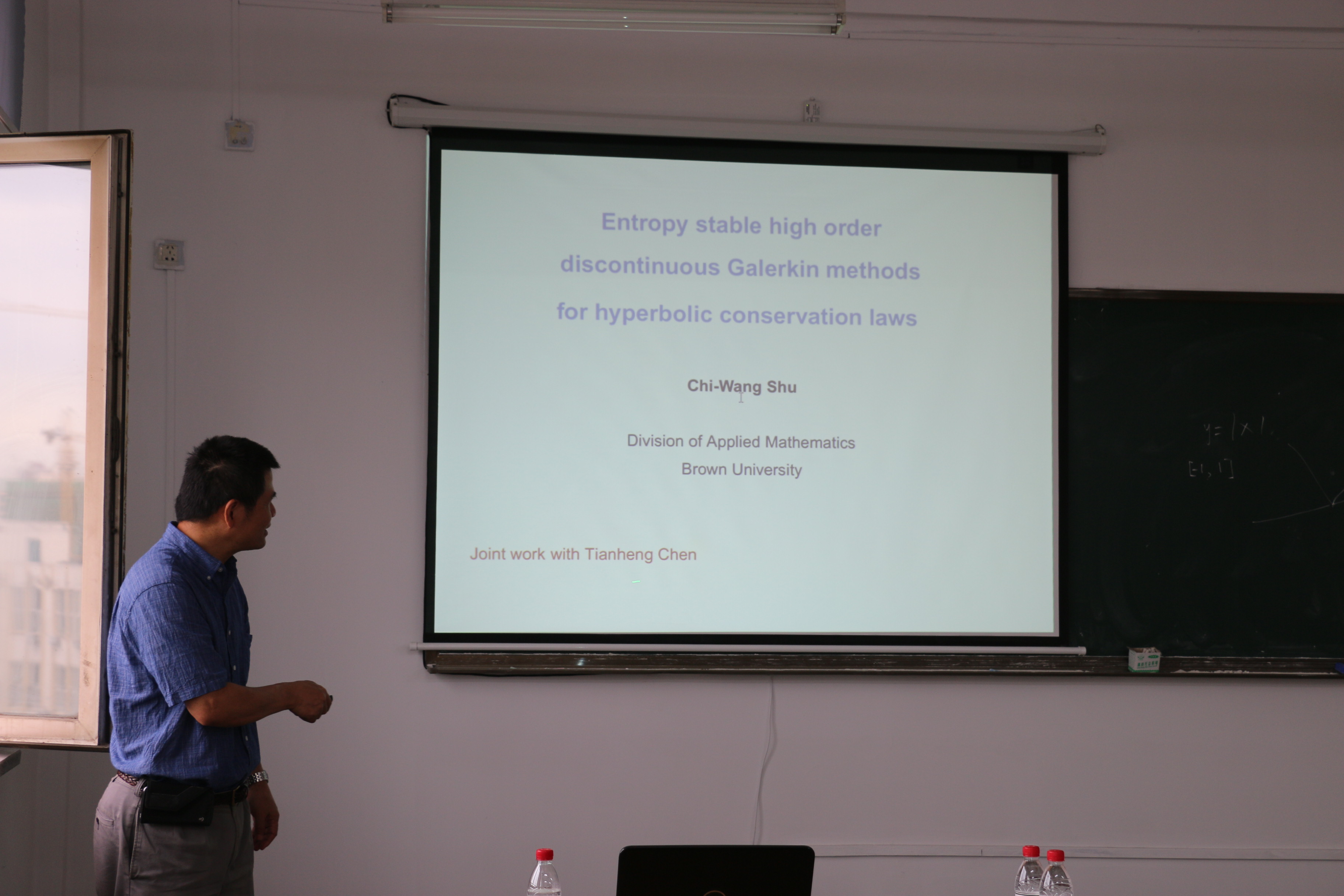 受国际合作处资助,应数学系吴勃英教授和数学系与数学研究院孟雄副教授邀请,美国布朗大学舒其望教授近日访问了taptap点点,并于2017年7月20日上午10:00-11:00在格物楼522会议室作了题为“Entropy stable high order discontinuous Galerkin methods for hyperbolic conservation laws”的学术报告,报告由孟雄副教授主持,数学系30余位师生听取了报告并进行了热烈的讨论。报告主要介绍了对于一般熵函数情形间断有限元方法的单元熵不等式、稳定性分析及算法实现。