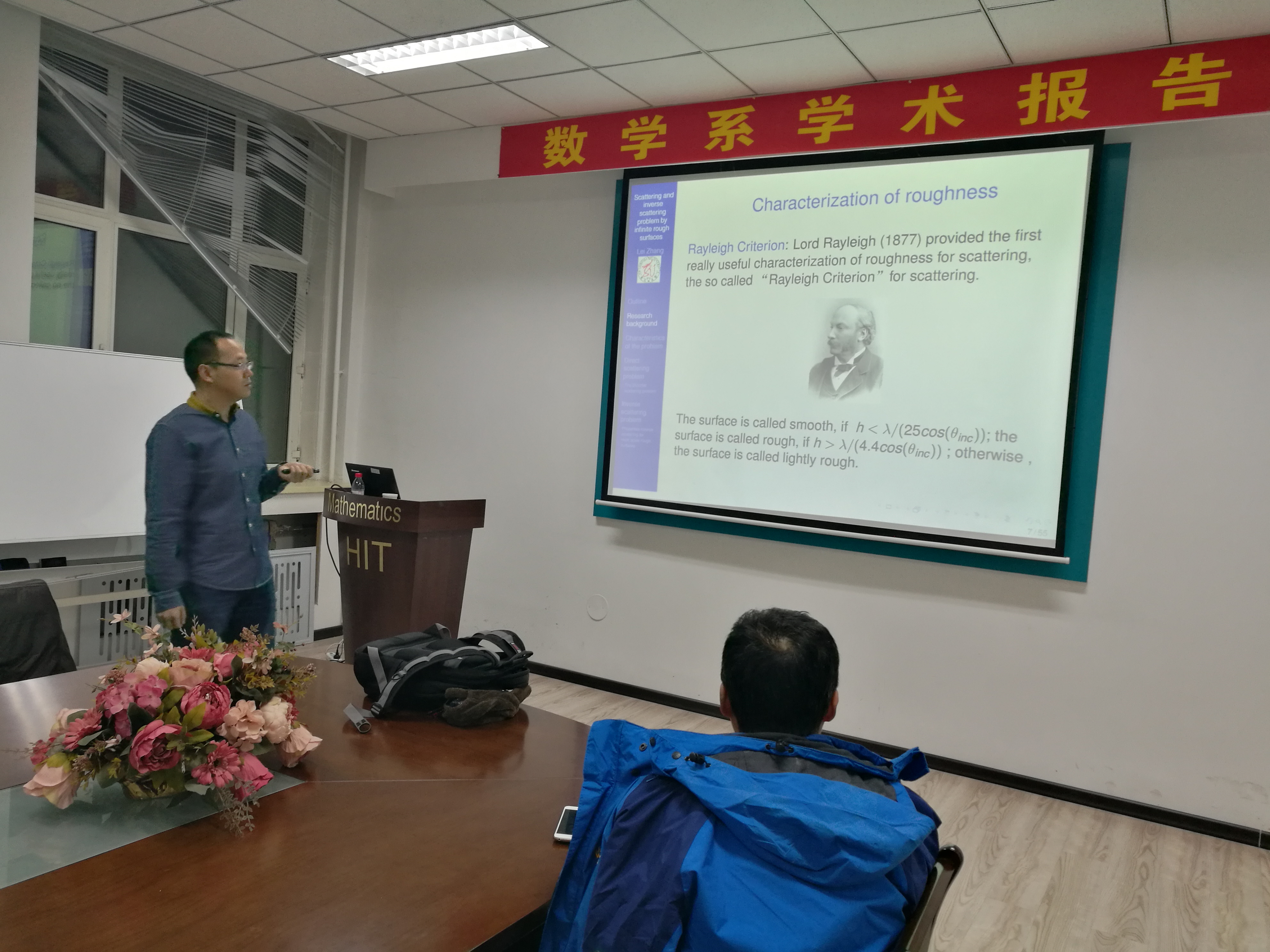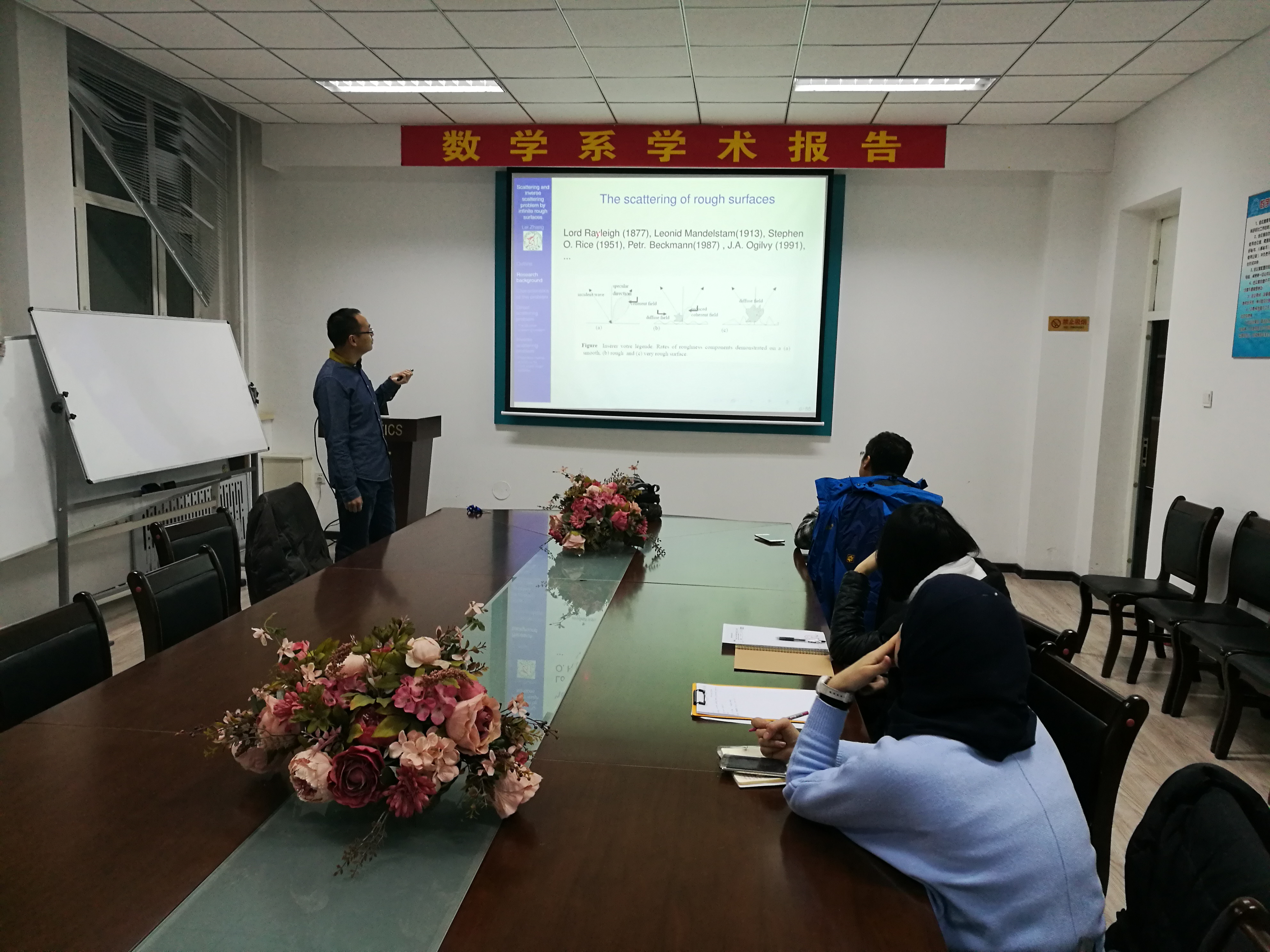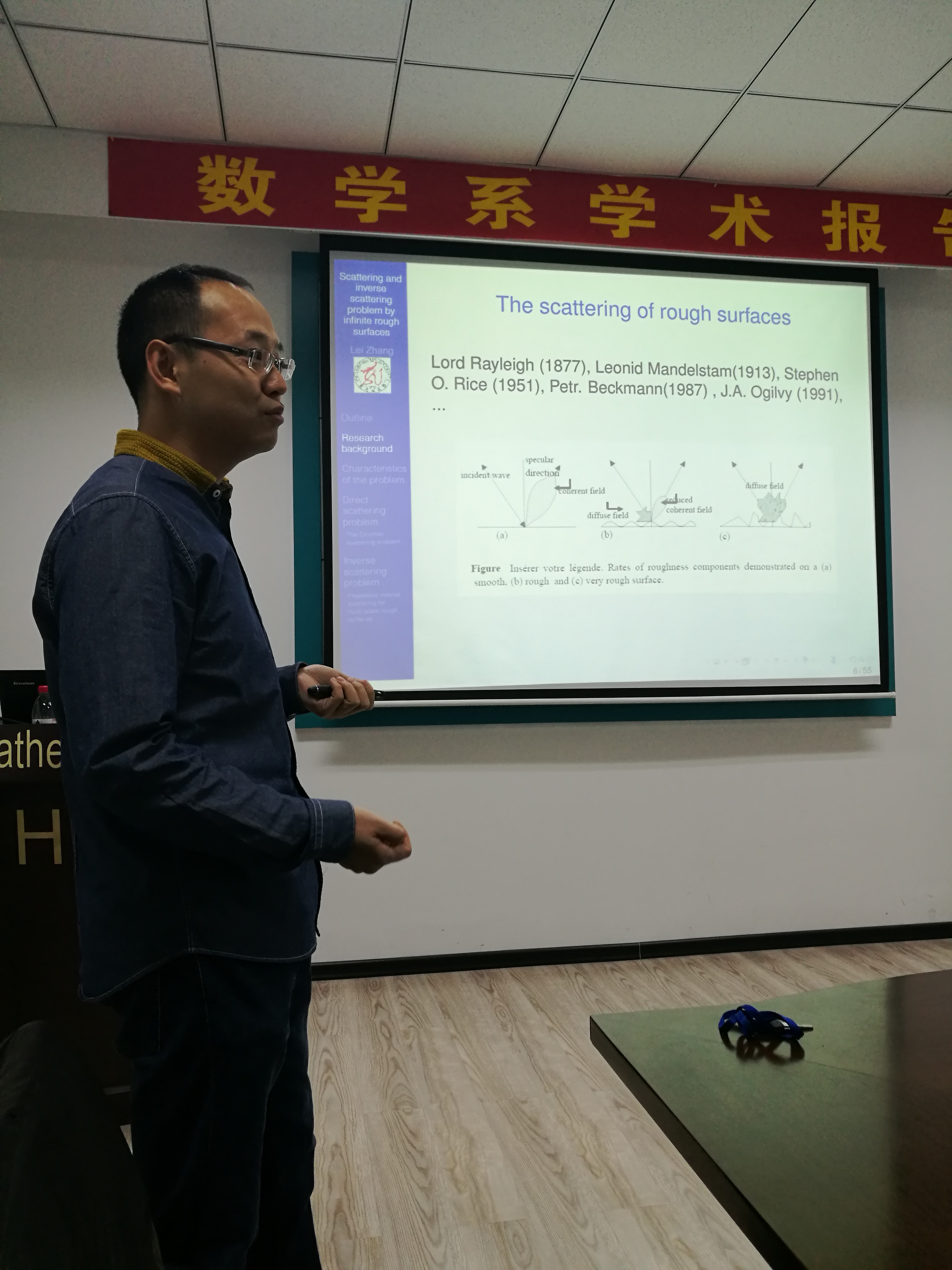 应数学系郭玉坤副教授邀请,黑龙江大学张磊副教授于2017年12月1日来taptap点点进行了成功的学术访问,并于12月1日下午16:00—17:00在格物楼503数学系报告厅做了一个关于粗糙曲面散射和反散射问题的学术报告,介绍了相关领域内理论和数值计算的最新进展。报告由郭玉坤副教授主持,数学系相关研究方向的师生听取了报告并进行了热烈的讨论。