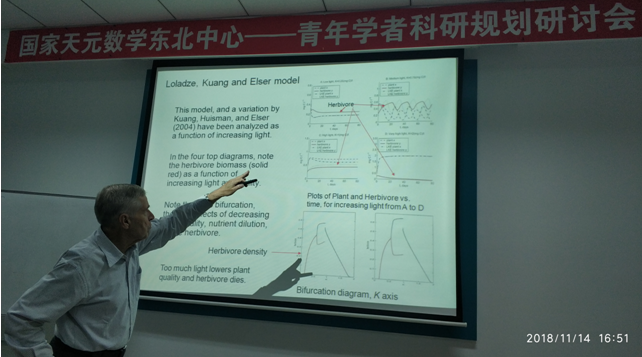 受学校国际合作与交流基金资助,应数学系刘胜强教授的邀请,美国迈阿密大学生物系Donald DeAngelis教授于2018年11月13--17日来哈工大数学系进行了成功的学术访问。并于11月14日下午14:30-16:00,16:00-17:30以及15日16:00-17:30分别在格物楼503室举行了理论生态学与数学生态学方面的三场讲座。DeAngelis教授的报告内容涉及异质性及周期环境生态学模型、植物-植食动物模型以及濒海湿地生态系统数学建模。报告由刘胜强教授主持,数学系相关方向的师生参加了报告会并与DeAngelis教授进行了热烈的学术交流与讨论。