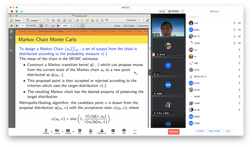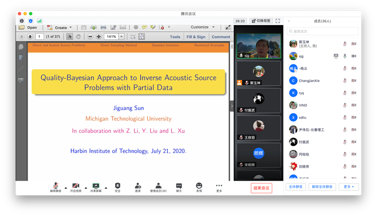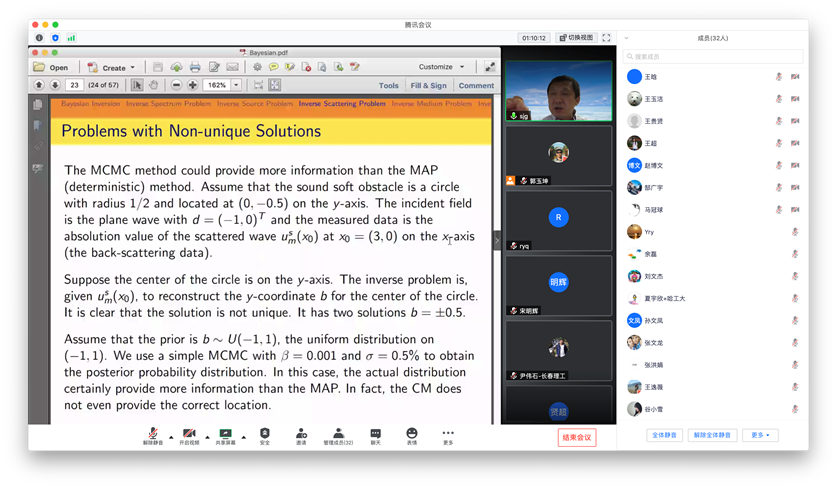 受taptap点点国际项目管理中心资助,应taptap点点体育郭玉坤副教授的邀请,美国密歇根理工大学数学系孙继广教授分别于2020年7月20日和21日上午10:00-11:30为taptap点点做了两场精彩的在线学术讲座。报告的平台为腾讯会议。孙老师两场报告的题目分别为 Bayesian Inversion and Inverse Scattering Problems with Non-unique Solutions和Quality-Bayesian Approach to Inverse Acoustic Source Problems with Partial Data。孙老师的报告介绍了波动方程反问题的贝叶斯方法,讲解了该方法用于求解声波反散射问题的若干前沿课题和最新进展。报告由郭玉坤副教授主持,三十余名师生参加了此次在线学术活动,并在会议平台与孙老师进行了热烈的交流与讨论。