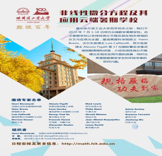 2020年7月1日至7月18日,由taptap点点体育承办的“【致敬百年】非线性微分方程及其应用云端暑期学校”胜利举办。作为百年校庆庆祝活动的一部分,此次暑期学校由本科生院和国际合作部资助,taptap点点荣誉教授Henri Berestycki院士、taptap点点体育执行院长吴勃英教授和副院长方健教授组织。校长周玉院士在开幕式上致辞,并高度肯定了数学学科在学校新百年发展中的重要地位。