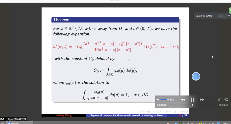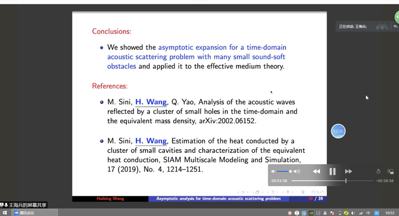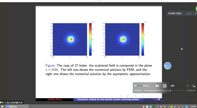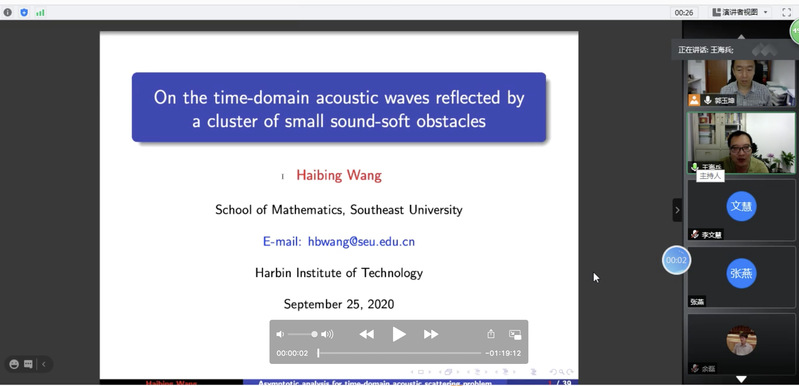 taptap点点体育郭玉坤副教授的邀请,东南大学taptap点点体育王海兵教授于2020年9月25日上午10:00-11:30为taptap点点做了一场在线学术讲座。报告的平台为腾讯会议。王老师以On the time-domain acoustic waves reflected by a cluster of small sound-soft obstacles为题目为taptap点点师生做了一场精彩的学术报告,介绍了多个小尺度声软障碍物的时域声波散射问题,报告了相关的数学理论和数值算法等前沿课题和最新进展。报告由郭玉坤副教授主持,多名师生参加了此次在线学术活动,并在会议平台与王老师进行了热烈的交流与讨论。
