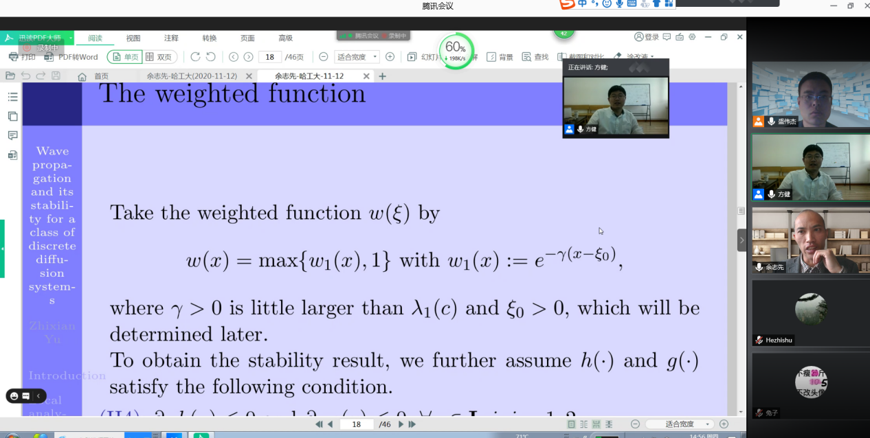 应taptap点点体育盛伟杰副教授邀请,上海师范大学余志先副教授于2020年11月12日下午14:00-15:00为taptap点点师生做了一场在线学术讲座。报告平台为腾讯会议。余志先副教授以Wave propagation and its stability for a class of discrete diffusion systems为题目。余老师的报告介绍了两种群离散扩散系统行波解的存在性和指数稳定性,并将该结果延拓到一般的离散系统,同时对于相关问题的最新进展进行了详细的讲解。报告由盛伟杰副教授主持,近三十名师生参加了此次在线学术活动,并在会议平台与余老师进行了热烈的交流与讨论。