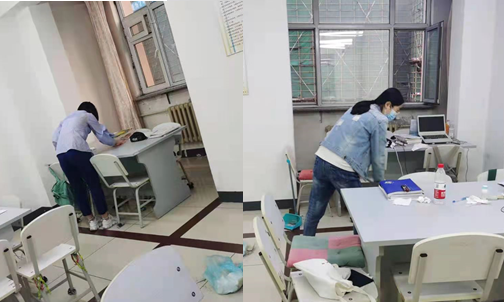 两支部党员同志分成七组分别在公寓楼长和阿姨的协调下,对十五和十六公寓自习室的卫生死角进行了清理。党员们仔细认真地对自习室的窗台、桌椅、柜子、门、地面进行清理,用消毒片做好自习室的消杀工作。