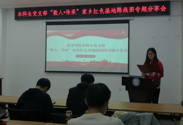 (张煜崧/文 肖舒彤/图)在庆祝新中国成立72周年之际,为引领支部党员学习贯彻习近平总书记“七一”重要讲话精神,进一步推动党史学习教育,用好支部党员利用暑期打卡家乡“红色地标”开展相关活动所形成的学习资料,党支部持续开展“数人·传承”家乡红色基地路线图创新工作项目,并于10月3日晚召开“数人·传承”家乡红色基地路线图专题分享会,党支部书记张煜崧同志主持会议。