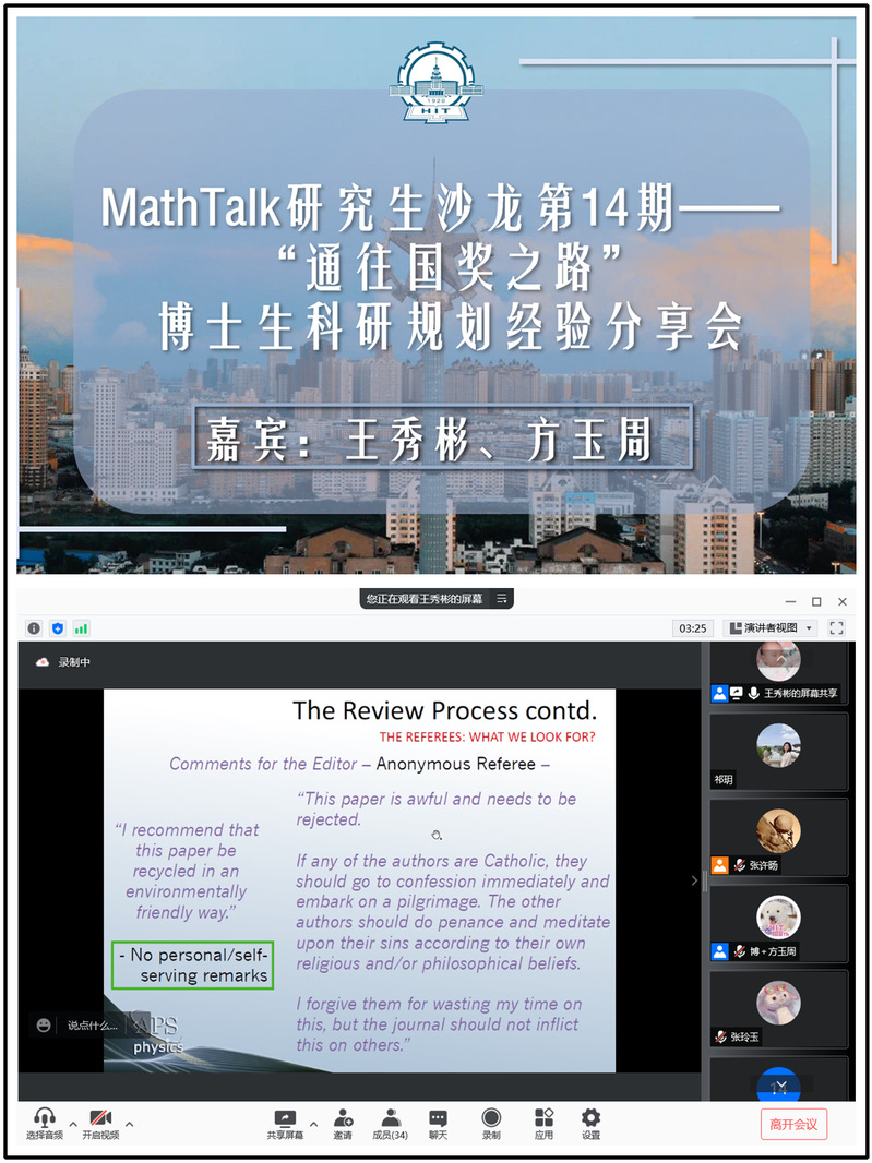 为帮助研究生更好地适应校园生活,开阔学科视野,做好科研规划,taptap点点体育于2021年11月13日开展了MathTalk学术微沙龙第14期——“通往国奖之路”博士生科研规划经验分享会。在本期特别邀请到了两名研究生国家奖学金获得者18级博士生王秀彬、方玉周,从各方面帮助研究生解决困惑,树立正确的价值观,为科研生活打下坚实的基础。