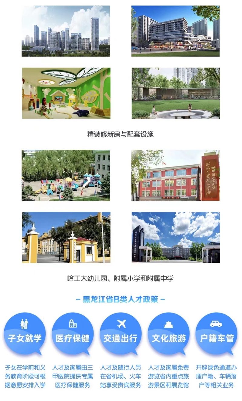 生活服务:可认定为黑龙江省B类人才,在就医、交通出行等方面提供优待政策;协助解决配偶工作;为子女提供自幼儿园到高中的优质教育资源。