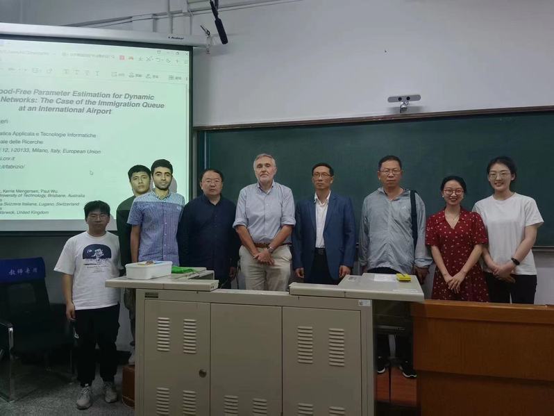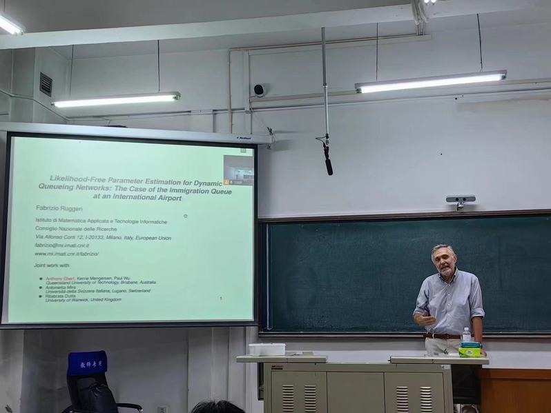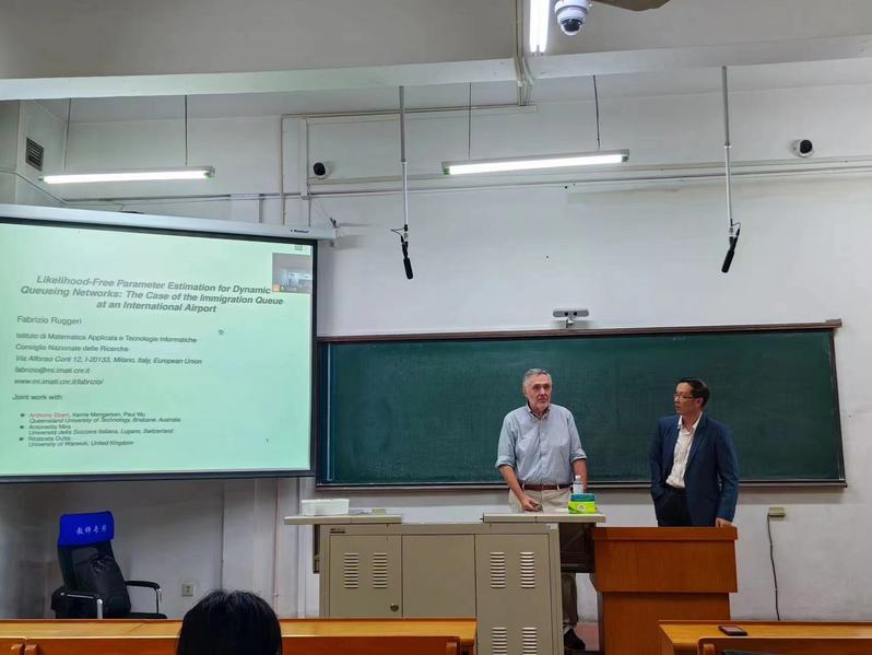 Fabrizio Ruggeri教授做了题目为“动态排队网络的无似然参数估计:以国际机场的移民队列为例”的精彩报告。简要介绍了贝叶斯方法和动态排队网络(DQN)系统。他解释说,过程(队列)由许多步骤组成,可以用抽样分布和参数先验对每个步骤进行建模,并且使用采样分布和前验可以生成伪数据。报告还介绍了使用 R 软件包 queuecomputer 对数据进行有效模拟。最后,他就今后可能开展的工作指明了方向,并回答了教师和研究生提出的一些问题。