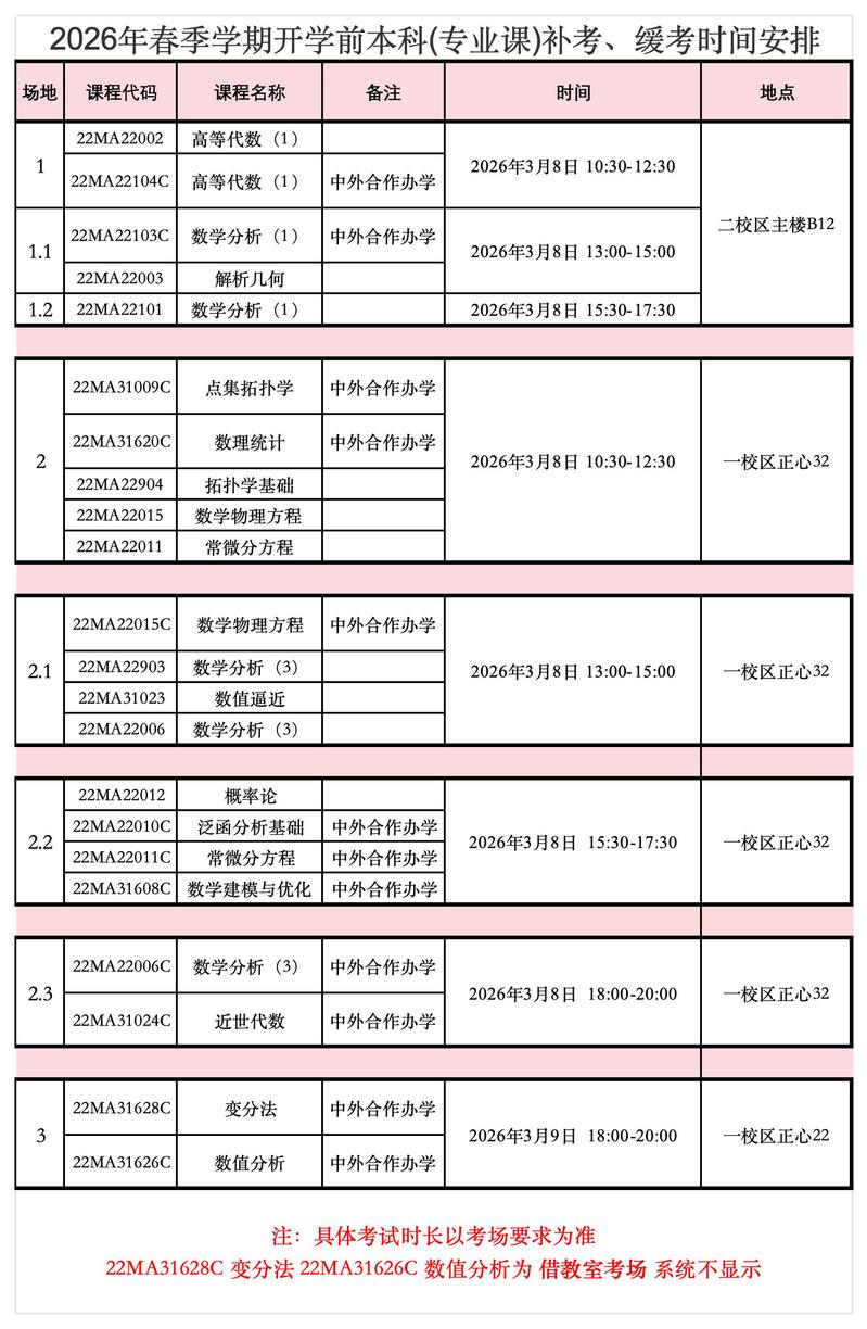 2026年春季学期开学前本科(专业课)补考、缓考时间安排